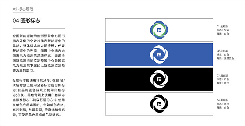 制約新能源消納的關(guān)鍵因素,為新能源的優(yōu)化布局和行業(yè)政策制定提供參考,促進我國新能源高質(zhì)量發(fā)展。 藍藍設(shè)計對全國新能源消納監(jiān)測預(yù)警中心的工作范圍做了調(diào)查研究,首先理解業(yè)務(wù)和核心競爭力,之后調(diào)查了行業(yè)相關(guān)品牌標志設(shè)計,聽取了大家的期望,之后設(shè)計出多版logo供選擇。標志設(shè)計確定后進行了VI和宣傳冊的設(shè)計。