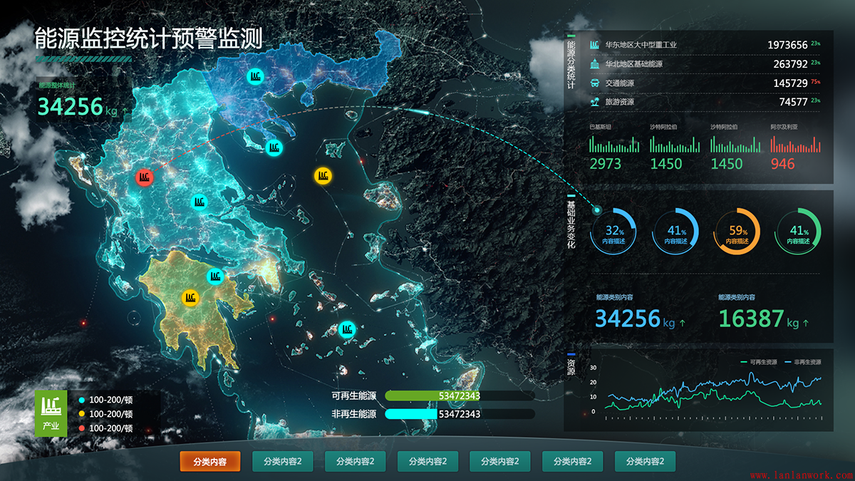 大屏可視化界面設計可謂是當今行業、企業發展的見證,生動直觀地再現了行業、企業的全貌。不僅作為展示,方便了解、監督;同時可以作為一個有效的管理平臺,帶來效益。大屏界面面向范圍廣,協同性好,易于被采用。下面幾個大屏的界面設計,沉穩的背景上,加上亮色作為點綴和強調。既不失其風格,又富有靈動性。