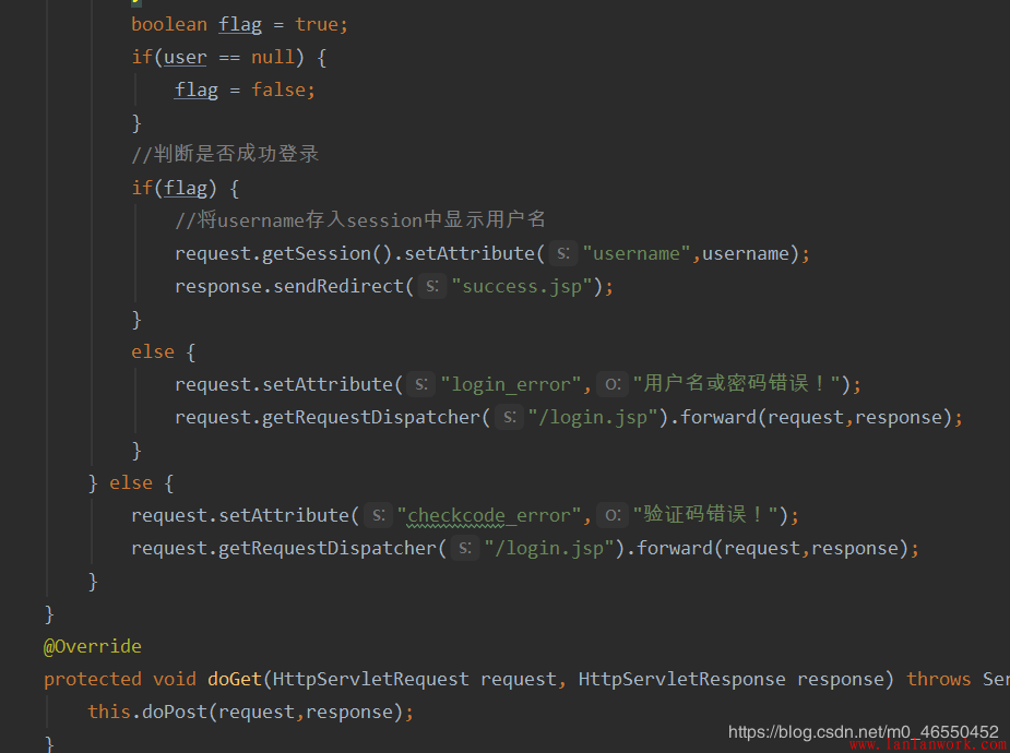 如下圖所示,為了保證servlet層能夠正確接收到界面所展示的驗證碼信息,同時因為session對象是項目自生成的,所以我直接獲取session對象并以類似于鍵值對的形式將頁面驗證碼信息存入session中。