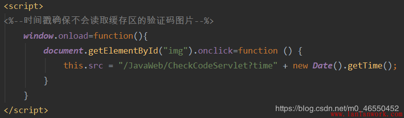 在這里,因為點擊驗證碼更換操作需要用到js,所以我百度得到了上圖這樣一串代碼。其中時間戳的作用是通過改變每次請求的時間參數來獲得刷新效果,即改變url中的響應頭信息。