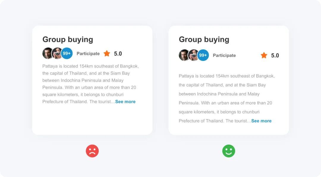 一個卡片內通常會包含圖片、標題、詳細介紹及行動按鈕等元素,這些元素需要以聚焦的形式去呈現,以幫助用戶快速掃描內容。當文本內容較長、展示的信息過多時,不利于用戶快速掃描,導致用戶無法在第一時間快速感知到產品想要展示的、或用戶想要知道的信息,很容易被用戶過濾。