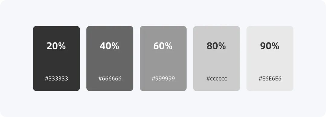中性色即色彩中的黑白灰,設定中性色是由調整HSB(色相/飽和度/亮度)中的B值高低里形成一個表現視覺強弱的等級階梯,一般設定4~5個等級即可,例如B值的20%(#333333)、40%(#666666)、60%(#999999)、80%(#CCCCCC)、90%(#E6E6E6)。