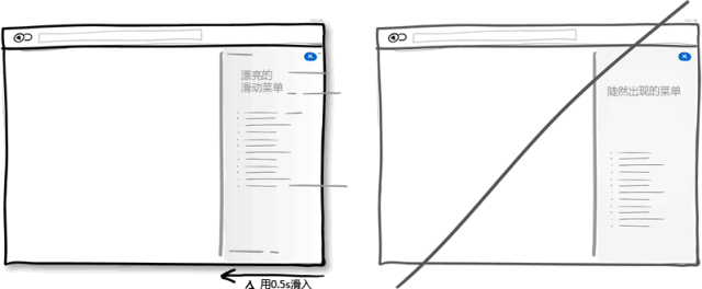 用戶進行操作過程中,界面上的元素會經常出現,隱藏,打開,關閉,放大縮小移位等。給這些元素增加些自然的動畫,淡入淡出效果不但美觀,也更符合實際,本來元素尺寸位置的變化就是一個需要時間的動畫過程。但要注意動畫時間不要設置過長,那樣會讓想盡快完成操作的用戶不耐煩。