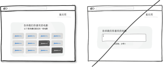 這一界面設計中的經典準則是有心理學依據的,相比要讓某人回想想某樣東西,從一堆東西中認出某樣東西會更容易些。辨識出一樣東西只需要我們稍微回憶一下,通過一些線索就可以完成。而回想則需要我們全面搜索自己的大腦。也許這也是為什么試卷上選擇題會比簡答題做得快的原因。所以試著在界面上展示一些用戶之前涉及到的信息讓他們進行選擇,而不是讓他們想半天然后自己填寫。