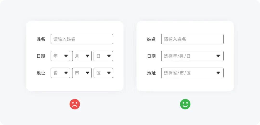 類似地址、日期這類層級內容,不要將其分成多個字段,最好做成聯動選擇讓用戶一氣呵成。