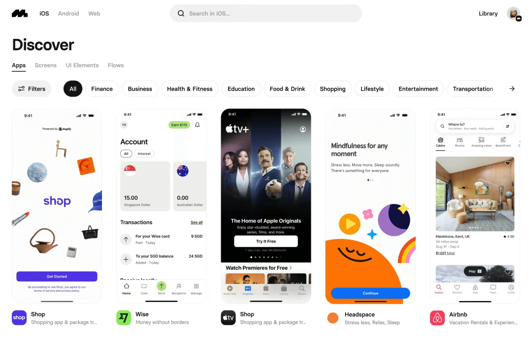 [Mobbin](http://mobbin.com) 是目前最大的UI/UX設計參考庫之一,提供了大量的移動應用和網站界面設計案例。與其他平臺不同,Mobbin 不僅展示首頁設計,還提供完整的用戶流程和交互設計參考。