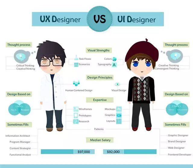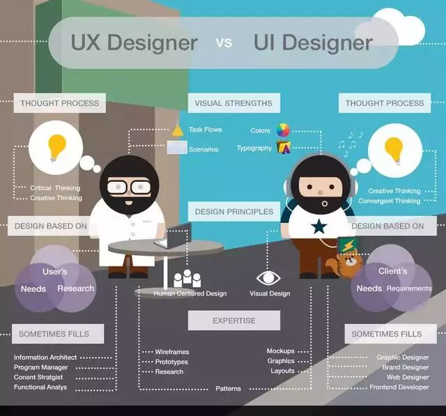 總結:UI設計是展現視覺層面的(界面),而UX是使用過程中的情感(互動與體驗)。UX設計師不僅關注界面的設計,更關心所有會影響使用者體驗的一切。如架構、互動、內容與及使用者對象、需求、價值觀。