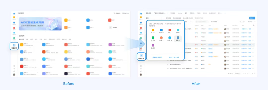 鼠標懸浮時,它就像一個傳送門一樣將用戶需要切換的應用呈現在浮層卡片上,用戶點擊所需的應用即可完成應用的切換。