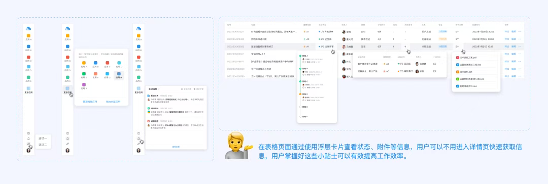 在表格頁面通過使用【浮層卡片】查看狀態、附件等信息,用戶可以不用進入詳情頁快速獲取信息,用戶掌握好這些小貼士可以有效提高工作效率。