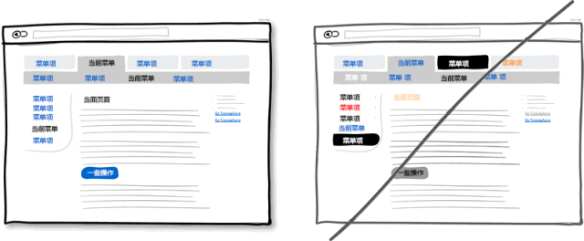 諸如顏色,層次及模塊間的對比這些視覺上的設計可以很好地幫助用戶使用產品:他時刻知道當前所處的頁面以及可以轉到哪些頁面。要傳達這樣一個好的界面,你就需要將可點擊的元素(比如連接,按鈕),可選擇的元素(比如單選多選框)以及普通的文字明顯區分開來。在下圖的例子中,我將點擊操作的元素設置為藍色,選中的當前元素為黑色。這樣適當的設計可以讓用戶很方面地在產品的各模塊間切換。但千萬不要把這三種元素設計得混亂不堪。