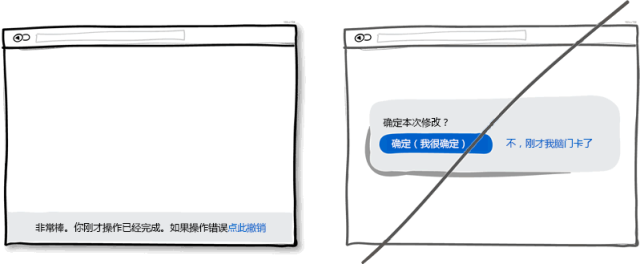 假設你剛點擊了一個連接或者按鈕,撤銷操作可以讓操作流暢自然,這也符合人類的本能。而每次操作都彈一個確定框則好像是在質問用戶你明白不明白這個操作會產生什么后果。我還是更習慣假設用戶每次操作都是正確的,其實只有極少數情況下才會發生誤操作。所以,為了防止誤操作而設計的確認窗口其實是不人性化的,用戶每次操作都需要進行毫無意義的確定。所以請考慮在你的產品里實現撤銷操作來增加用戶的操作友好度吧。