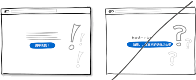 你可以通過不確定而顫抖的聲音來表達傳遞自己的意思,當然也可以通過很自信的方式表達。如果你在界面中的表述用語多以問號結束,比如"也許","可能","感興趣?" 或者"想要試試么?",那么你完全還可以把語氣變得更堅定一些。不過萬事無絕對,或許適當放松措詞讓用戶有自行思考的余地也是可以的。