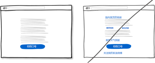 為了滿足各式用戶的需求,在頁面上放些鏈接鏈到這里鏈到那里是常見的做法。如果你的主要目的是想讓用戶點擊頁面最后那個下載按扭什么的話,就需要三思了。因為用戶可能點擊了其他鏈接離開頁面了。所以你需要注意頁面的鏈接數量,最好將用于導航與用于操作的鏈接用樣式區分開。盡量移除頁面不需要的鏈接會讓用戶點擊到你的功能按鈕。