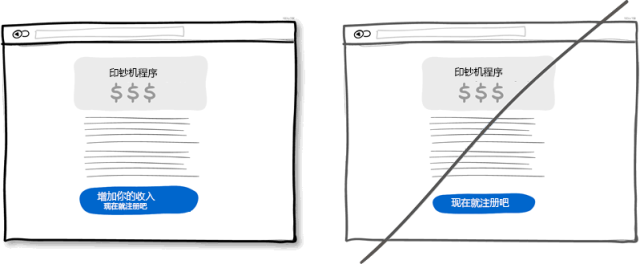 試想界面上有這樣兩個按鈕:一個是"獲取折扣",另一個是"立即注冊"。我敢打賭大多數人會點擊第一個,因為第二個按扭讓人感覺不到有利可圖,并且"注冊"讓人聯想到填不完的表單。也就是說讓用戶感受到獲利的按鈕更有可能被點擊。這種讓用戶感到好處的文字信息也可放在按鈕旁邊,不一定要做為按鈕的標題。當然,正常的按鈕還是有用處的,一般用于重復性操作頻繁的地方。