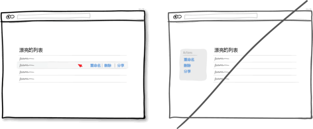 不用說直接在元素身上進行操作是更直觀明了的方式。比如在一個列表中,我們想讓用戶對每個條目進行操作那么就把按鈕放到當前條目上,而不要把放到列表之外。再比如就是直接點擊元素就進入編輯狀態(比如頁面上的地址信息點擊后可以進行編輯)。這種方式比傳統的選中再點擊相應的按鈕進行操作要簡潔省事得多。當然,對于一般性的操作本身就不需要有什么上下文的,就沒必要這么做了,比如頁面上的前進,后退按扭。