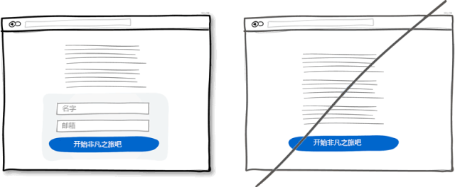 在一個足夠大的寬屏界面上最好還是直接給出表單,這比點擊按鈕再彈出表單要好很多。首先減少了點擊操作,流程變得簡潔也節省了時間。其次,直接呈現出表單可以讓用戶知道表單有多長,其實也是在告訴用戶注冊花不了多少時間。當然,這條規則適合注冊表單非常簡單的情況。