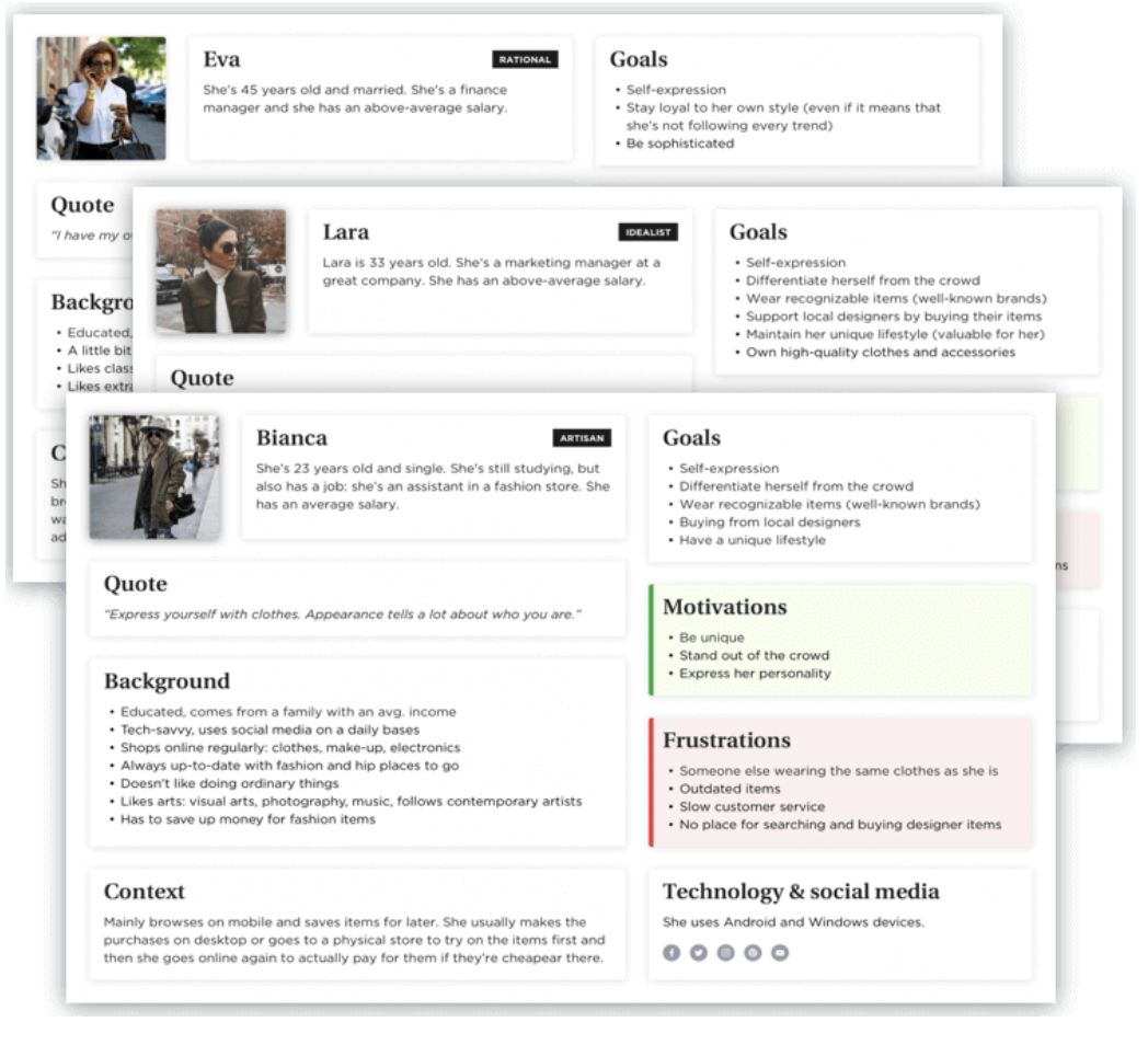 按照我們的邏輯順序,首先是創(chuàng)建角色。我們幾乎在所有項目中都會使用?;谖覀兊漠a(chǎn)品或服務的目標群體,即不同的潛在客戶,構建虛構人物個性。這個工具可以讓我們更多地了解客戶的需求、問題、動機和行為。我們通過研討會、頭腦風暴或通過定性和定量研究“簡單地”收集盡可能多的數(shù)據(jù)來實現(xiàn)這一目標。
