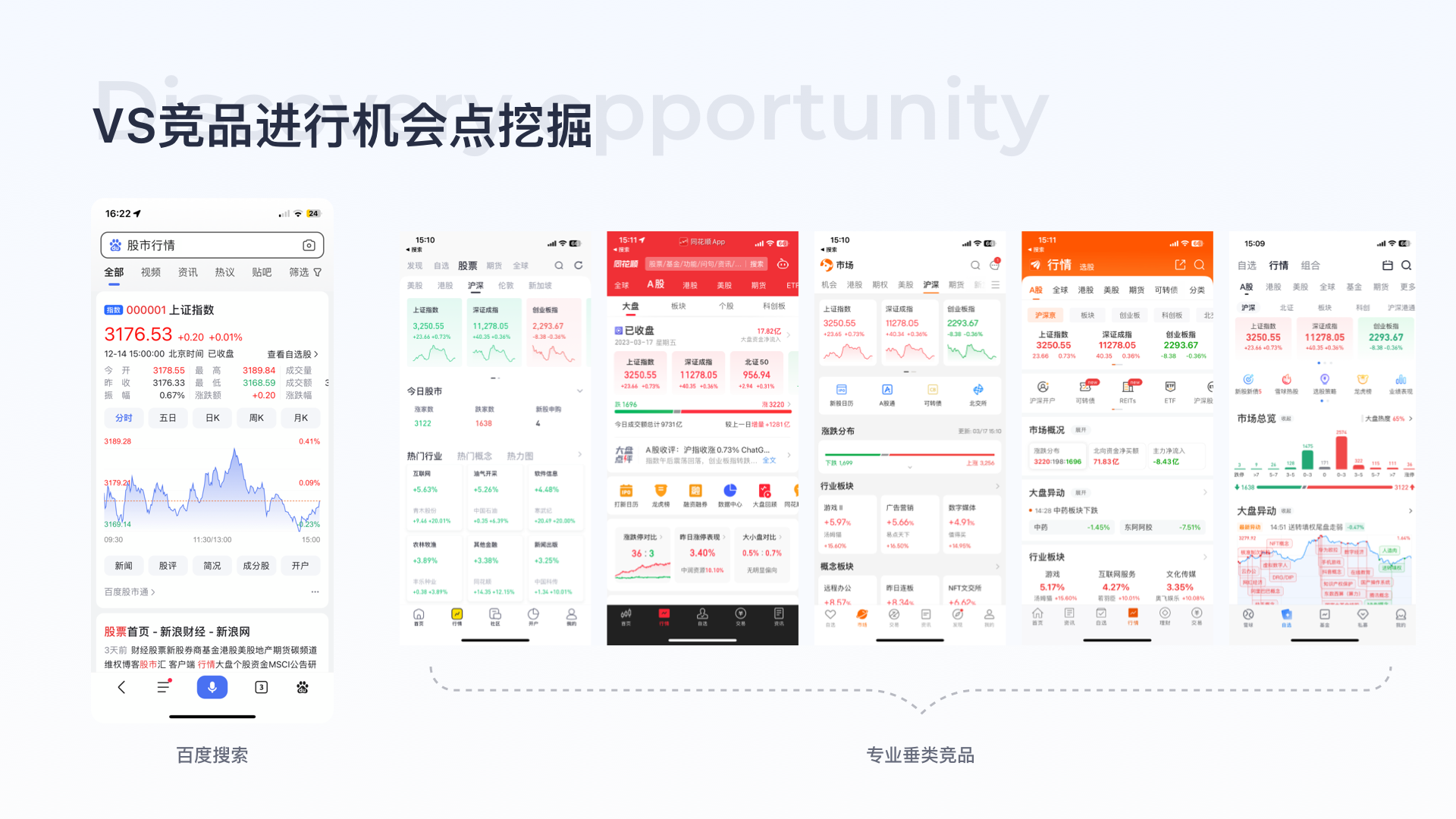 用戶需求:結合用戶高頻使用功能分析發現小白用戶、一般散戶、專業用戶均對行情功能有高頻率的使用需求,具體需求包括了解多市場、關鍵指數行情、了解最新快訊、重要行情動態、盤前/盤中/盤后簡報,再結合小白用戶占比高且對百科內容有需求的現狀,知識科普信息也是相關待滿足需求。