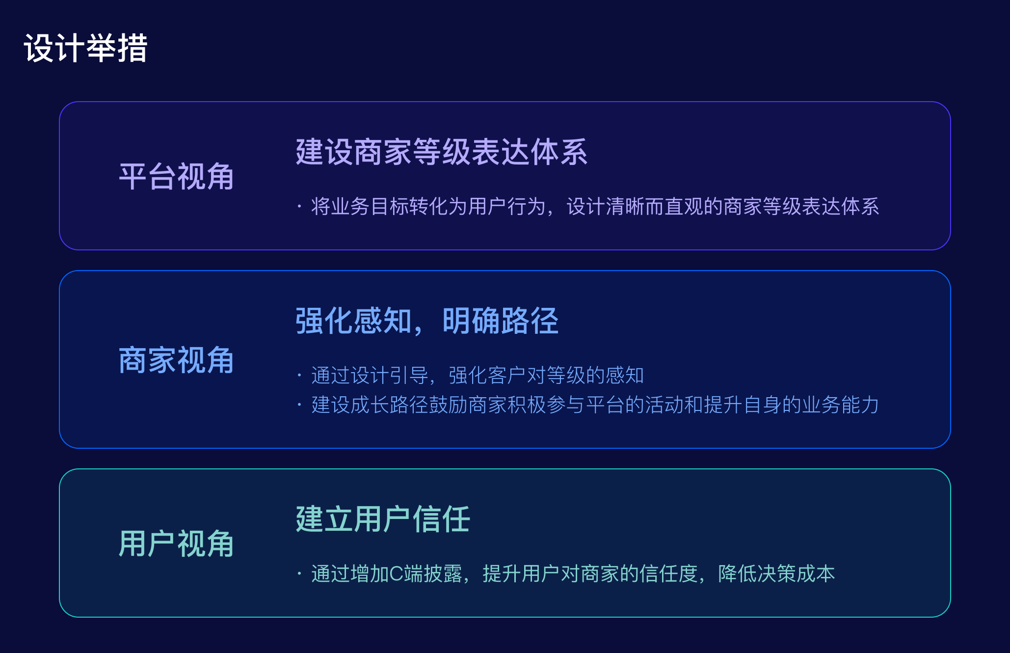 我們需要建立C端用戶信任,傳達商家等級的重要性,提升用戶對商家的認可度和信任度,幫助用戶減少決策成本,同時增加商家的自豪感和動力,促進商家與用戶,商家與平臺之間的價值轉化。