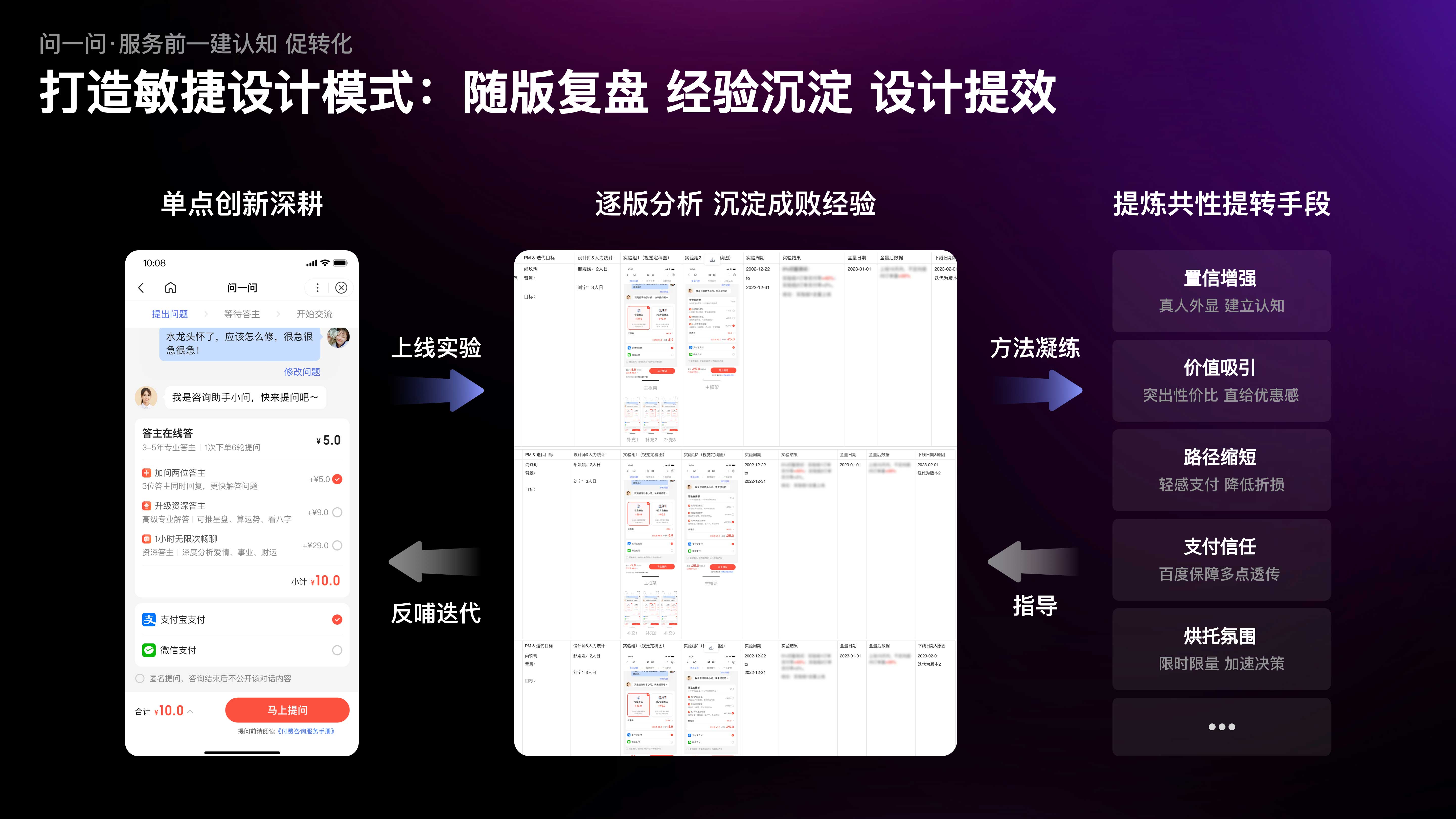 ?為了進(jìn)一步提升設(shè)計(jì)效率,我們將提問頁的迭代歷史進(jìn)行線上化記錄,并組織團(tuán)隊(duì)定期復(fù)盤總結(jié),提煉出「真人外顯-增強(qiáng)置信感」「優(yōu)惠直給-突出性價(jià)比」「路徑縮短-弱化支付感」等一系列通用的提轉(zhuǎn)手段;又將這些手段復(fù)用到服務(wù)上下游環(huán)節(jié)的同類場景中,通過系統(tǒng)化提轉(zhuǎn),有效幫助業(yè)務(wù)訂單量、GMV大幅提升。