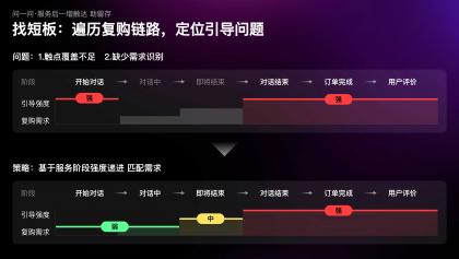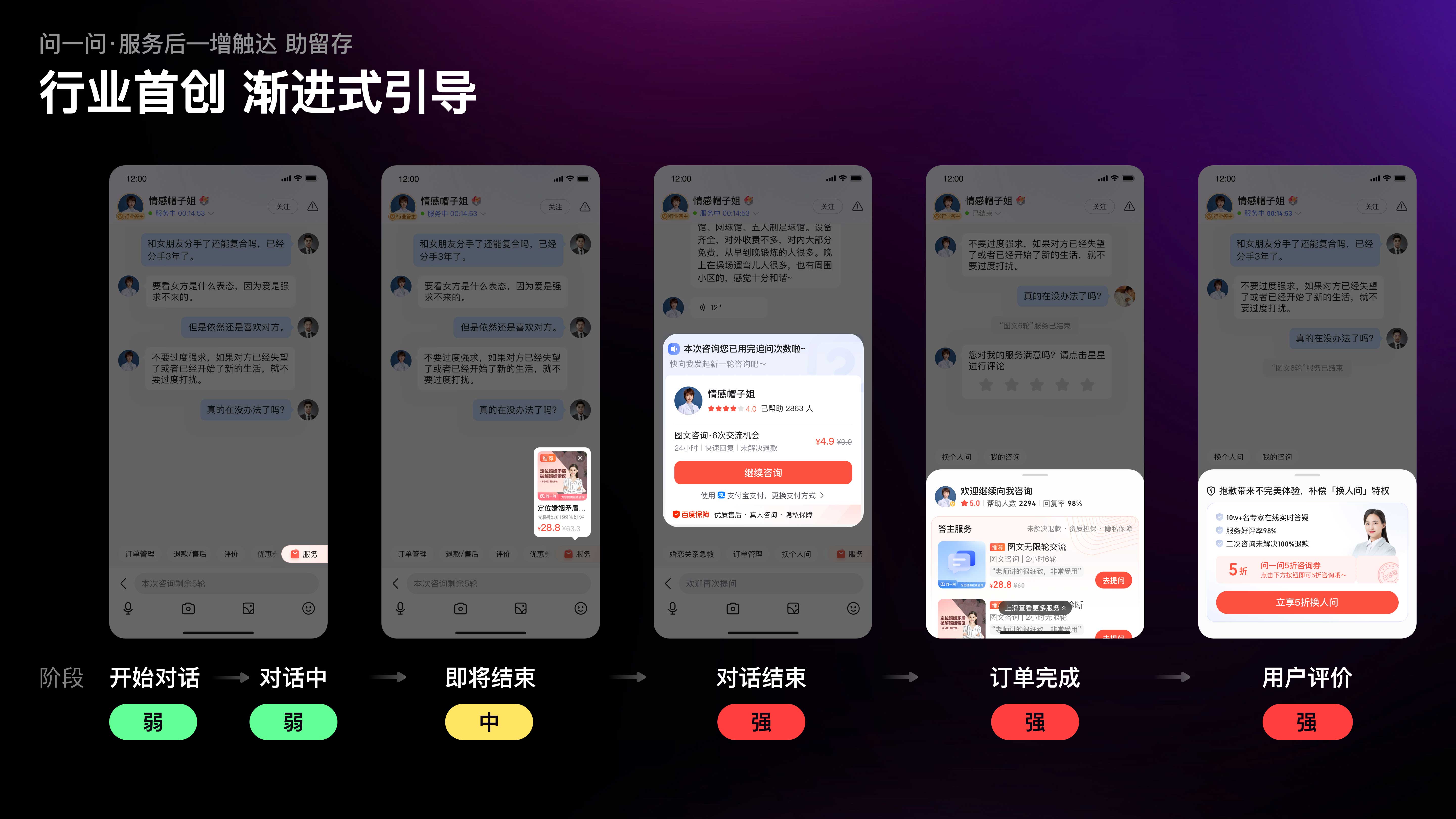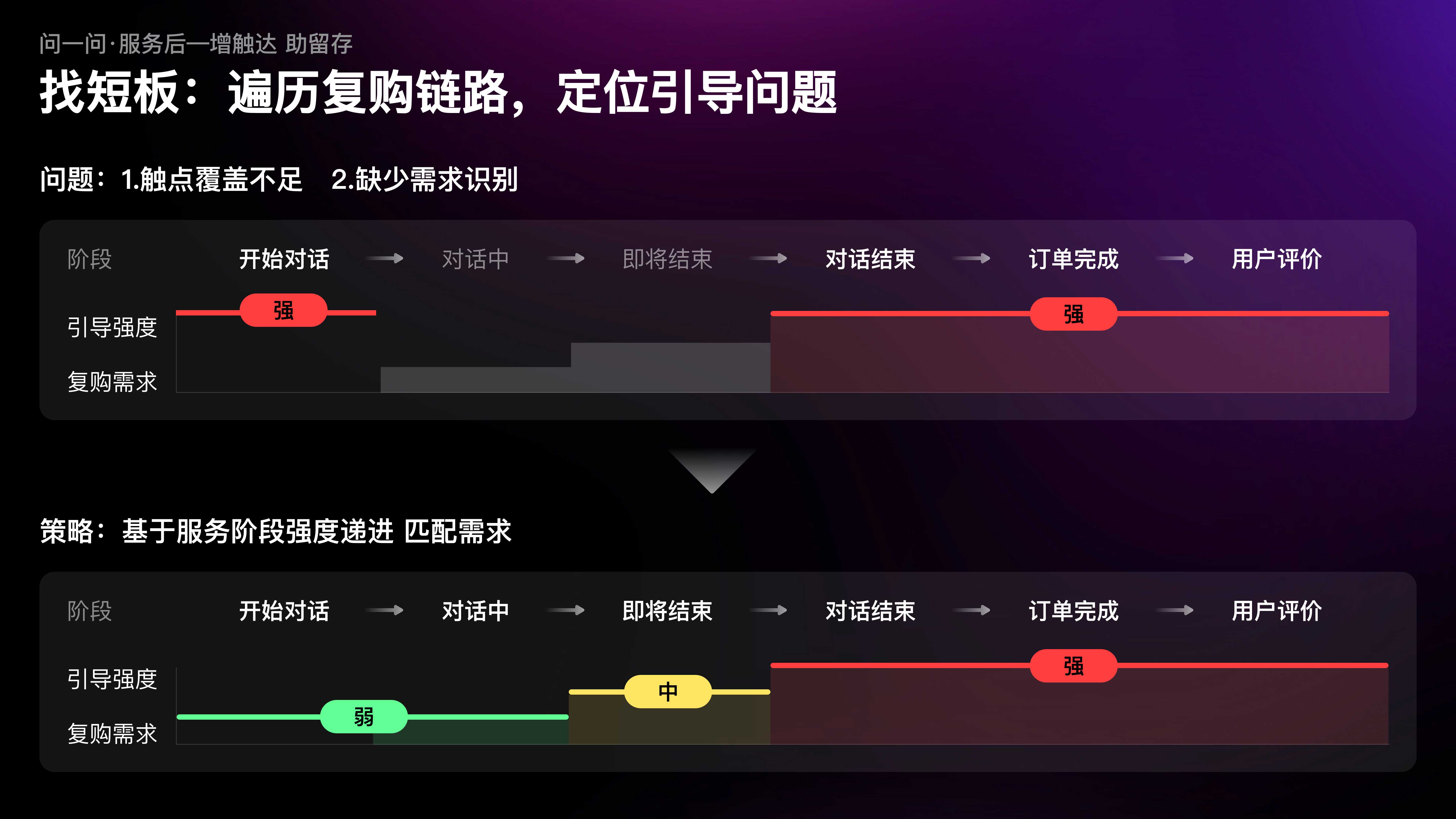 當(dāng)我們以用戶視角,遍歷咨詢鏈路中的復(fù)購引導(dǎo)時(shí),發(fā)現(xiàn)復(fù)購引導(dǎo)的觸點(diǎn)覆蓋不足,且缺少對特定場景下需求的識別,例如在咨詢開始時(shí)復(fù)購需求極弱,但設(shè)計(jì)引導(dǎo)極強(qiáng);而在隨后的對話過程中需求漸增,但引導(dǎo)缺失。因此,我們制定了行業(yè)首創(chuàng)的漸進(jìn)式引導(dǎo)策略;隨著服務(wù)推進(jìn),復(fù)購需求漸增,觸達(dá)強(qiáng)度也逐級遞進(jìn)。