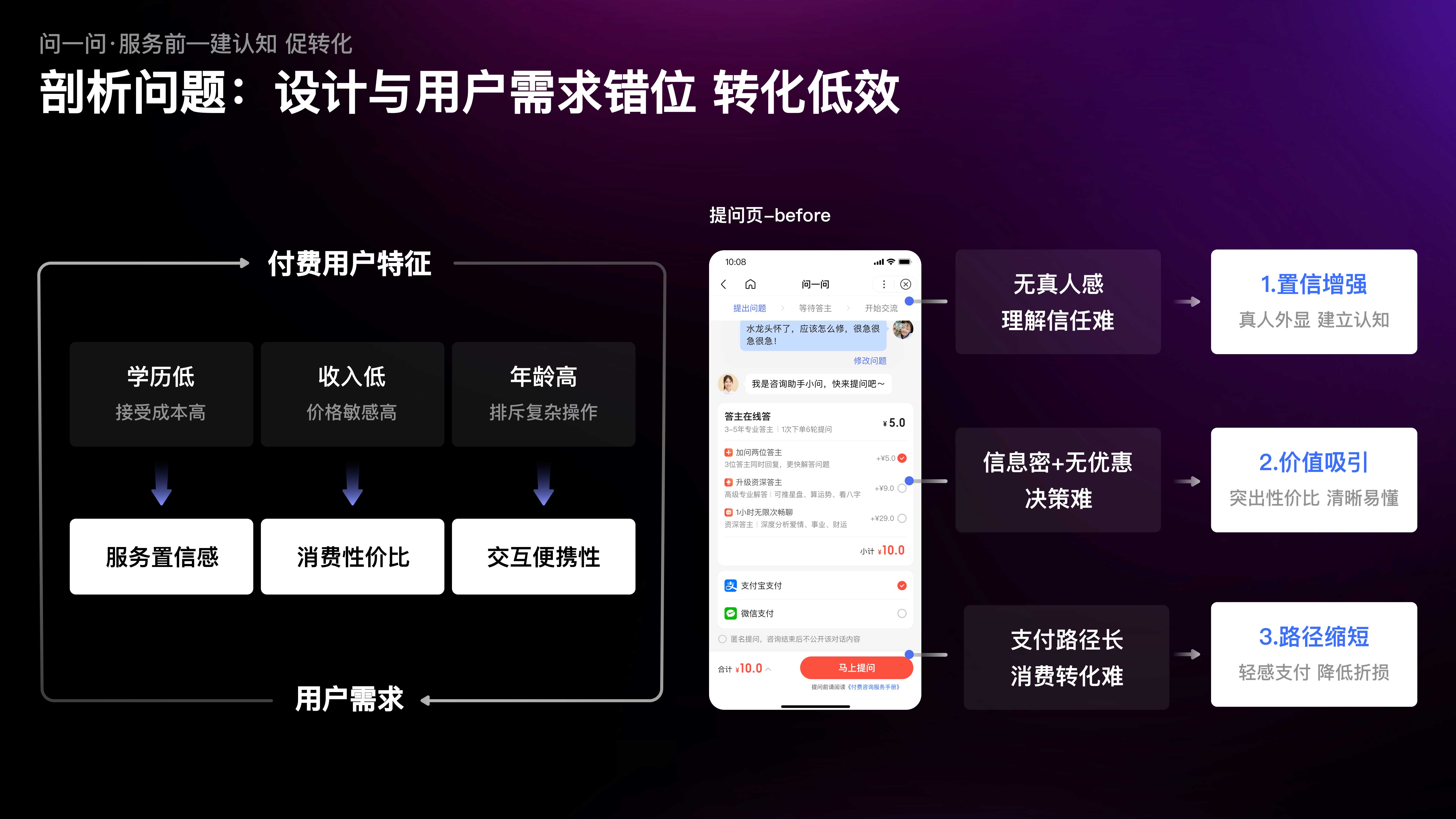 提問是服務(wù)閉環(huán)的起點(diǎn),也是業(yè)務(wù)的核心創(chuàng)收場景。在舊版提問頁中,服務(wù)價(jià)值的傳遞與我們“價(jià)格高敏”的主流客群需求發(fā)生錯(cuò)位,服務(wù)的置信感、吸引力、易用性都有提升空間。因此,在新版方案中,我們通過三大設(shè)計(jì)手段綜合解決:前序鋪墊環(huán)節(jié)多點(diǎn)位透傳真人服務(wù)感知,商品選擇環(huán)節(jié)通過突出價(jià)值對比和優(yōu)惠感來加速?zèng)Q策,壓縮步長打造輕量支付體驗(yàn)降低付費(fèi)焦慮感。