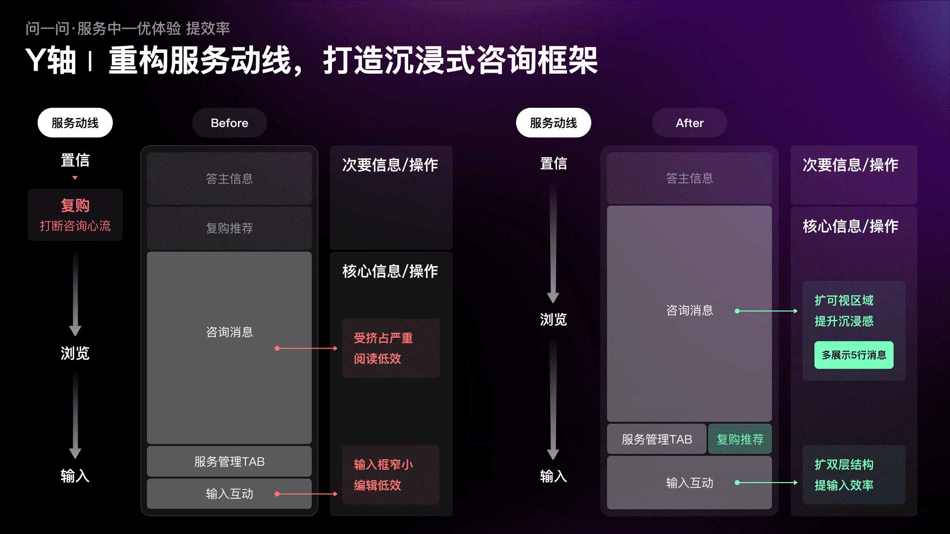 ?到了新的發(fā)展階段,我們的設(shè)計(jì)愿景該如何實(shí)現(xiàn)?問一問設(shè)計(jì)團(tuán)隊(duì)以“服務(wù)體驗(yàn)”為原點(diǎn),發(fā)起了C端核心服務(wù)體驗(yàn)的升級專項(xiàng)。借助用戶觀察、體驗(yàn)遍歷等方法,沿用戶真實(shí)體驗(yàn)路徑梳理服務(wù)“前-中-后”各階段的關(guān)鍵問題、挖掘優(yōu)化機(jī)會(huì)。再結(jié)合設(shè)計(jì)、體驗(yàn)雙視角,建立以服務(wù)前“建認(rèn)知、促轉(zhuǎn)化”、服務(wù)中“優(yōu)體驗(yàn)、提效率”、服務(wù)后“增觸達(dá)、助留存”為核心指導(dǎo)原則的設(shè)計(jì)打法。通過切實(shí)滿足用戶在服務(wù)各階段需求來激發(fā)持續(xù)消費(fèi)、讓服務(wù)閉環(huán)順暢運(yùn)轉(zhuǎn),從而有效地賦能業(yè)務(wù)增長,達(dá)到體驗(yàn)和收入的雙豐收。