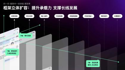 為實(shí)現(xiàn)這個(gè)目標(biāo),我們突破現(xiàn)有框架,創(chuàng)新制定了沿XYZ軸立體擴(kuò)容的思路。在Y軸方向上,進(jìn)行了屏效的優(yōu)化,滿足工具提效需求;沿Z軸拓展了層級,滿足多元服務(wù)和互動(dòng)需求;最后,沿X軸探索第二空間,承載創(chuàng)新型體驗(yàn)。