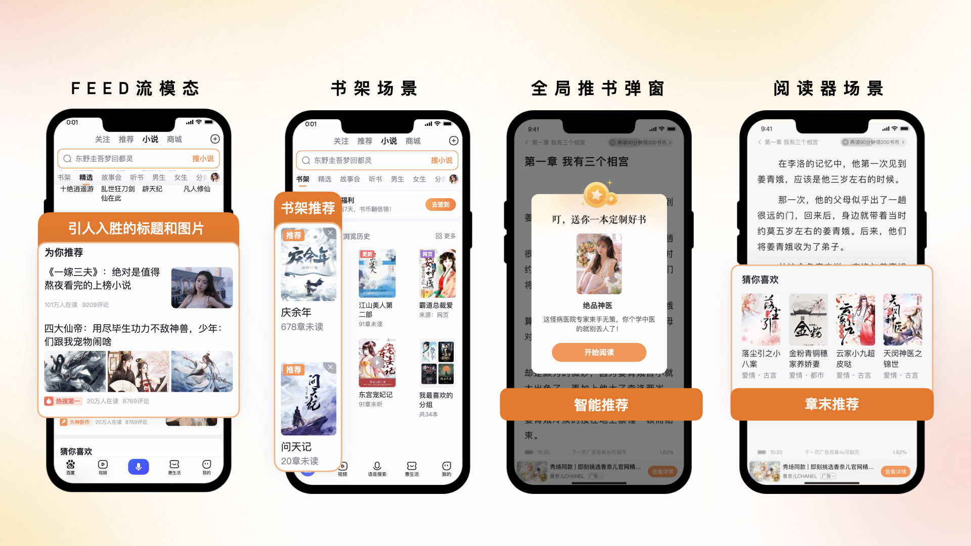 在推薦形式上,我們也采用了多樣化的推薦方式。例如在首頁增加了feed流形態(tài)的信息模塊,以更直觀的圖文展現(xiàn)方式,幫助用戶發(fā)現(xiàn)他感興趣的內(nèi)容。在書架場景,針對于書架內(nèi)容少的用戶,自動的放置兩本高流量書籍,幫助用戶高效的觸達內(nèi)容。與此同時,我們還會根據(jù)用戶行為數(shù)據(jù),采用彈窗形式和章尾推薦等形式主動向用戶推薦與其喜好度高的內(nèi)容,方便用戶高效的觸達他感興趣的內(nèi)容。
