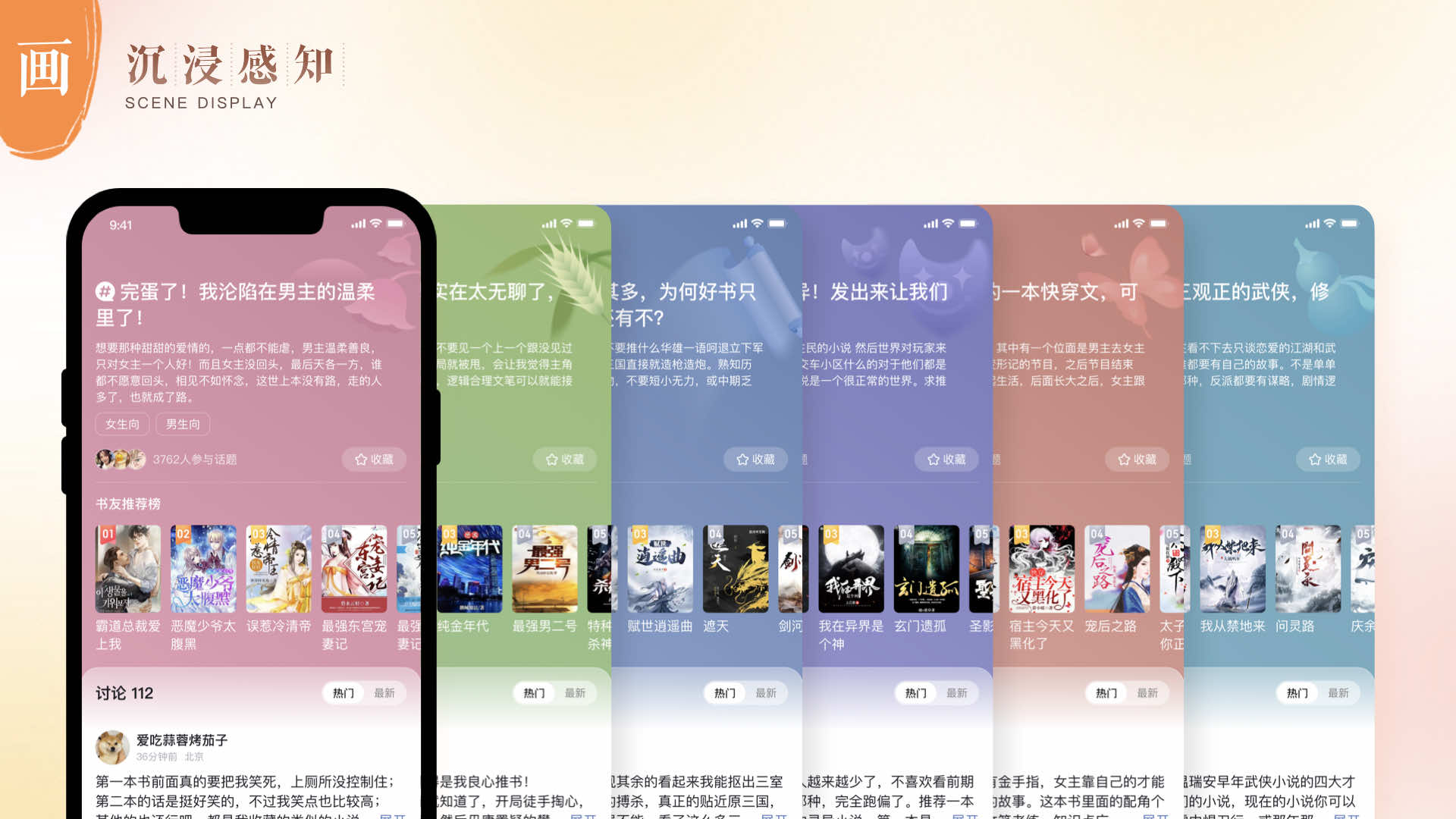 人文感設(shè)計語言融合了簡約、舒適、自在的設(shè)計體驗,讓人能夠輕松沉浸其中,并感受到獨特的國風(fēng)韻味和情感內(nèi)涵。小說設(shè)計團隊從“色、字、構(gòu)、畫”四個維度進行拆解。