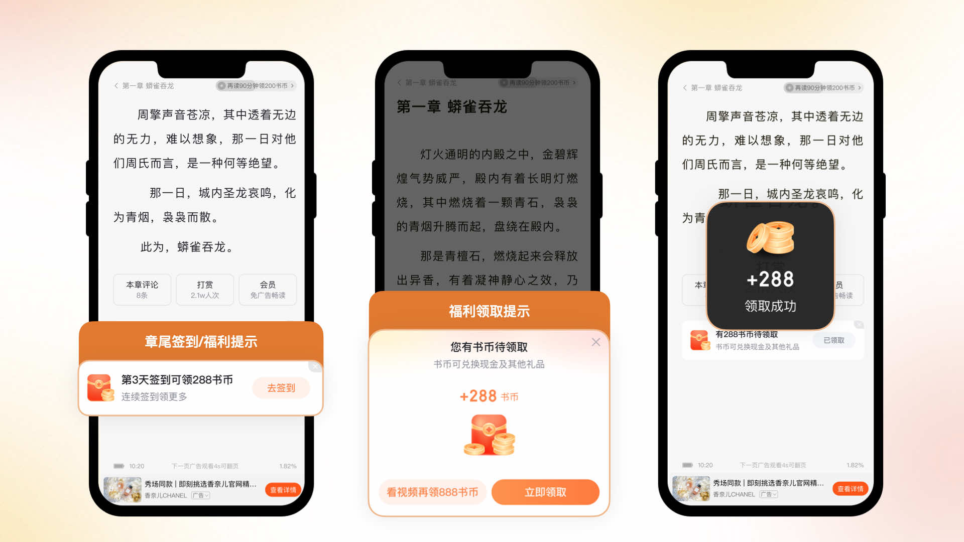 在閱讀器場景,我們增加了章尾和半層金幣領(lǐng)取提示,即時提醒用戶領(lǐng)取福利,同時,強化領(lǐng)取成功樣式,增強用戶的獲得感。