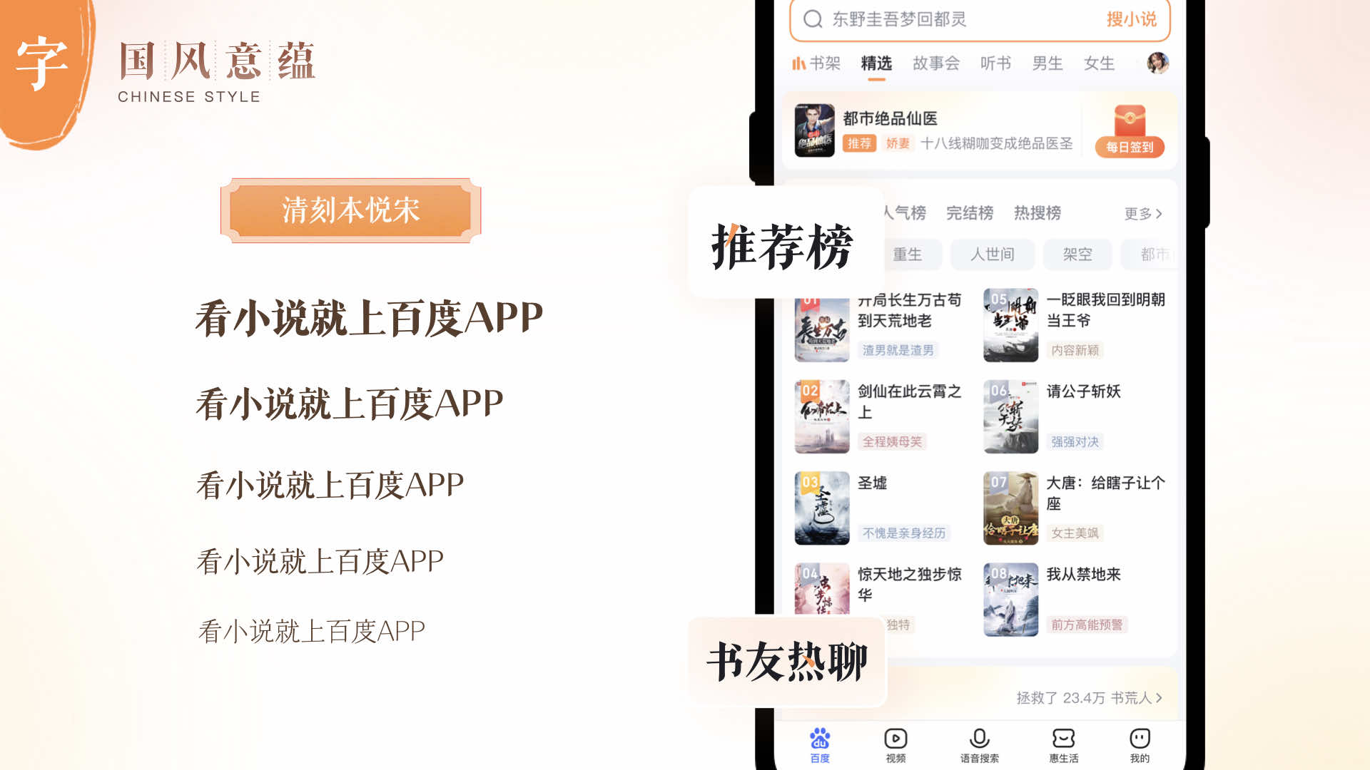 宋朝詩人汪洙在《神童詩》中有這樣的千古名句:“萬般皆下品,唯有讀書高。”讀書自古以來是成為高雅風(fēng)韻的文人士大夫的必經(jīng)之路。由此可見,自古以來讀書和雅致之間就結(jié)下了不解之緣,閱讀與國風(fēng)雅頌的風(fēng)格也就找到了完美的交匯點,因此小說設(shè)計團隊在確定設(shè)計風(fēng)格的探尋中,選擇了國風(fēng)的風(fēng)格來體現(xiàn)百度小說的人文感的設(shè)計。