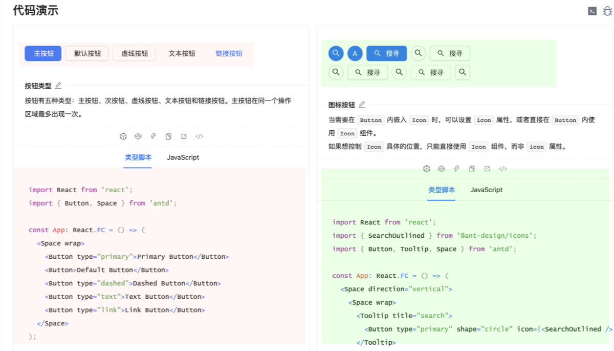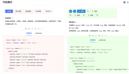 組件和組件庫的設(shè)計(jì)和搭建過程中,需要了解系統(tǒng)平臺,是蘋果端還是安卓,web端,不同的系統(tǒng)設(shè)計(jì)的差異性很大,對應(yīng)系統(tǒng)的控件類型我們也要很熟練的掌握。例如安卓一直保留的原生的底部導(dǎo)航欄的操作控件(返回、主頁、菜單),反觀蘋果最早出現(xiàn)在底部的HOME鍵,隨著硬件設(shè)計(jì)的升級,物理按鈕的作用已經(jīng)完全被交互手勢操作替代,根據(jù)設(shè)計(jì)準(zhǔn)則,可以先設(shè)計(jì)出確定的初版組件樣式,然后設(shè)計(jì)師們要熟悉項(xiàng)目業(yè)務(wù),深挖每個功能中的不同業(yè)務(wù)場景,并設(shè)計(jì)出對應(yīng)的業(yè)務(wù)組件;這樣設(shè)計(jì)師最終對于當(dāng)前組件進(jìn)行整合分類,做出版本的組件庫;組件和組件庫是設(shè)計(jì)和開發(fā)相結(jié)合的,設(shè)計(jì)師呈現(xiàn)頁面上的模塊是直觀的,但都是技術(shù)人員進(jìn)行底層代碼拼接的再封裝而成的,有規(guī)模的公司一般都會做成開源的組件庫。去提升項(xiàng)目人員之間的協(xié)作效率,復(fù)用率高,節(jié)省成本。如下圖是Ant design里面的部分按鈕組件的樣式和代碼演示,作為國內(nèi)獨(dú)一檔的免費(fèi)學(xué)習(xí)的設(shè)計(jì)體系網(wǎng)站。如果大家能夠從頭到尾研究一遍,相信對你構(gòu)建組件和組件庫有十分大的幫助。