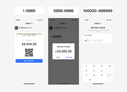 業(yè)務(wù)場景123主要應(yīng)用金額輸入框組件,輸入框組件根據(jù)用戶操作行為,會有不一樣的設(shè)計(jì),用戶沒有任何操作,輸入框內(nèi)有默認(rèn)文案提示“輸入付款金額”,用戶輸入金額后,計(jì)算單位超過‘百’,數(shù)字金額上方會有單位提示,同時顯示刪除按鈕,支持刪除,重新輸入,業(yè)務(wù)場景2中根據(jù)金額輸入范圍定義了產(chǎn)品業(yè)務(wù)規(guī)則,再細(xì)分出三種場景,不同范圍內(nèi)的金額,可以對應(yīng)的組件設(shè)計(jì)方案解決確認(rèn)轉(zhuǎn)賬確認(rèn)問題;