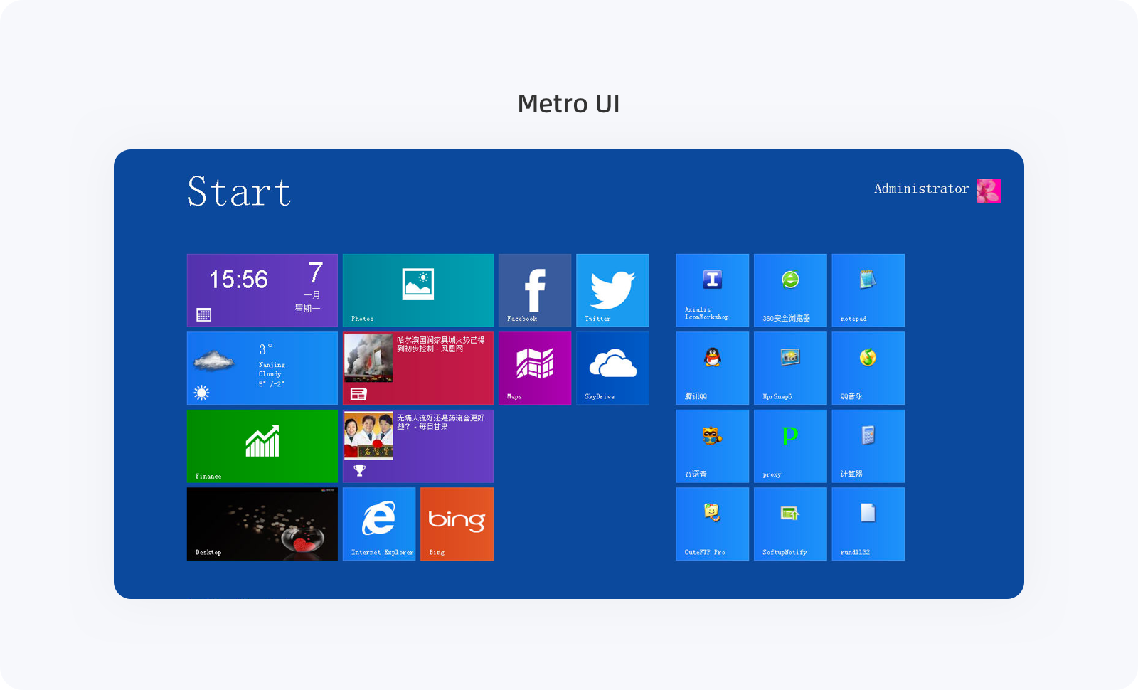 將復雜的設計簡單化,剔除大部分多余元素是奧卡姆剃刀在設計中的核心理念,但它并不是一味的強調簡單的就是好的、復雜的就是差的,應確定好這兩種形式的邊界在哪里、目的是什么。回歸設計本身,剔除的目的不在于追求至簡,而是通過合情合理的減法讓用戶更好的接收信息以及完成目標,一旦“剔”的過猛就會傷筋動骨。2007年,巨頭企業微軟推出的 Metro UI 就是一個很好的例子,全面去除光影、色彩變化以及質感等細節,直接以簡單的色塊+icon組合展示,讓其變的毫無層次感,多用一點時間就會發現這種簡潔過于單調,很容易讓人產生審美疲勞。雖說微軟設計師的這套扁平設計理念新穎且超前,但用戶并沒有買賬,極度的扁平直接導致極度的冷淡。Metro UI 的失敗讓后面的 Windows 10 直接放棄了這套設計語言,重新引入了豐富的細節,讓設計從純粹的扁平中得以解脫。超前一代是天才,超前兩代就是瘋子,很顯然,Metro UI 超前過頭了,這一反面案例應該值得所有設計師深思。當然,這么說有點“馬后炮”的味道,但前輩們已踩過的坑就是我們最好的避坑經驗。