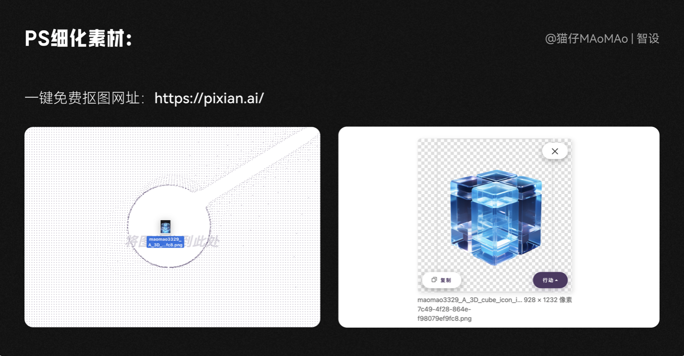 3D主視覺的部分,我們需要先進行摳圖,如果不想使用 PS 手動摳圖,這里推薦我常用的一鍵免費摳圖網(wǎng)站:https://pixian.ai/ ,處理簡單的圖片,直接把圖片扔進去就好了,簡單好用~