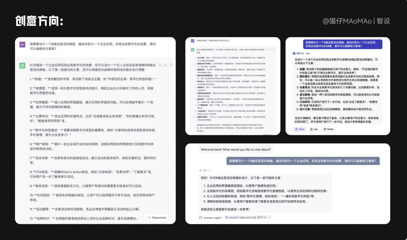 在沒有設計方向的時候,不妨讓AI大語言模型來幫助我們,它會根據(jù)需求的業(yè)務場景,給出合理的內(nèi)容建議,以及畫面元素的建議。