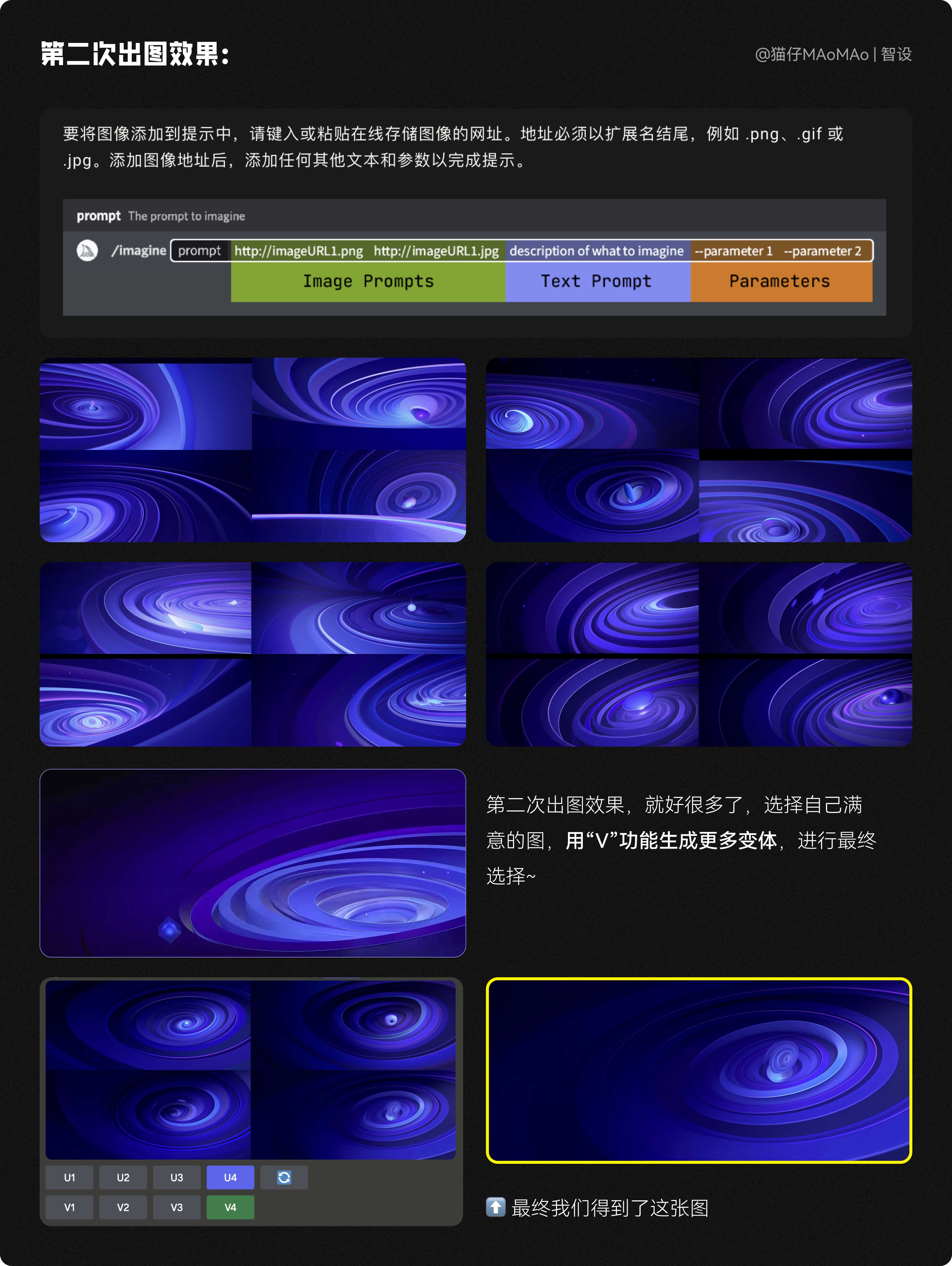 文生圖:顧名思義,需要自己腦暴出關鍵詞出圖,再通過修改關鍵詞,不斷踐行嘗試出圖。圖生圖:在有參考圖的情況下,用 /describe 圖生文命令,讓系統(tǒng)直接生成關鍵詞,再通過修改關鍵詞,不斷進行嘗試;我們先使用這種方式生成背景素材。