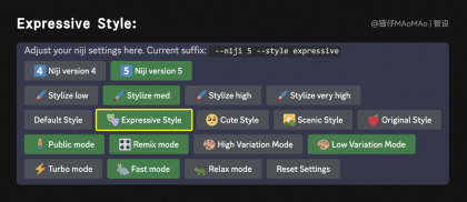 因為是單個元素生成,背景環(huán)境關鍵詞可以省略,大家在編寫關鍵詞時,注意靈活增減,不用一定按照所謂的公式來寫,藝術(shù)風格是插畫素材,我們直接使用niji模型,其中expressive風格會讓插畫更加富有表現(xiàn)力,可以直接在關鍵詞后面加上后綴“--style expressive ”,或者用“/settings”命令,更改設置。