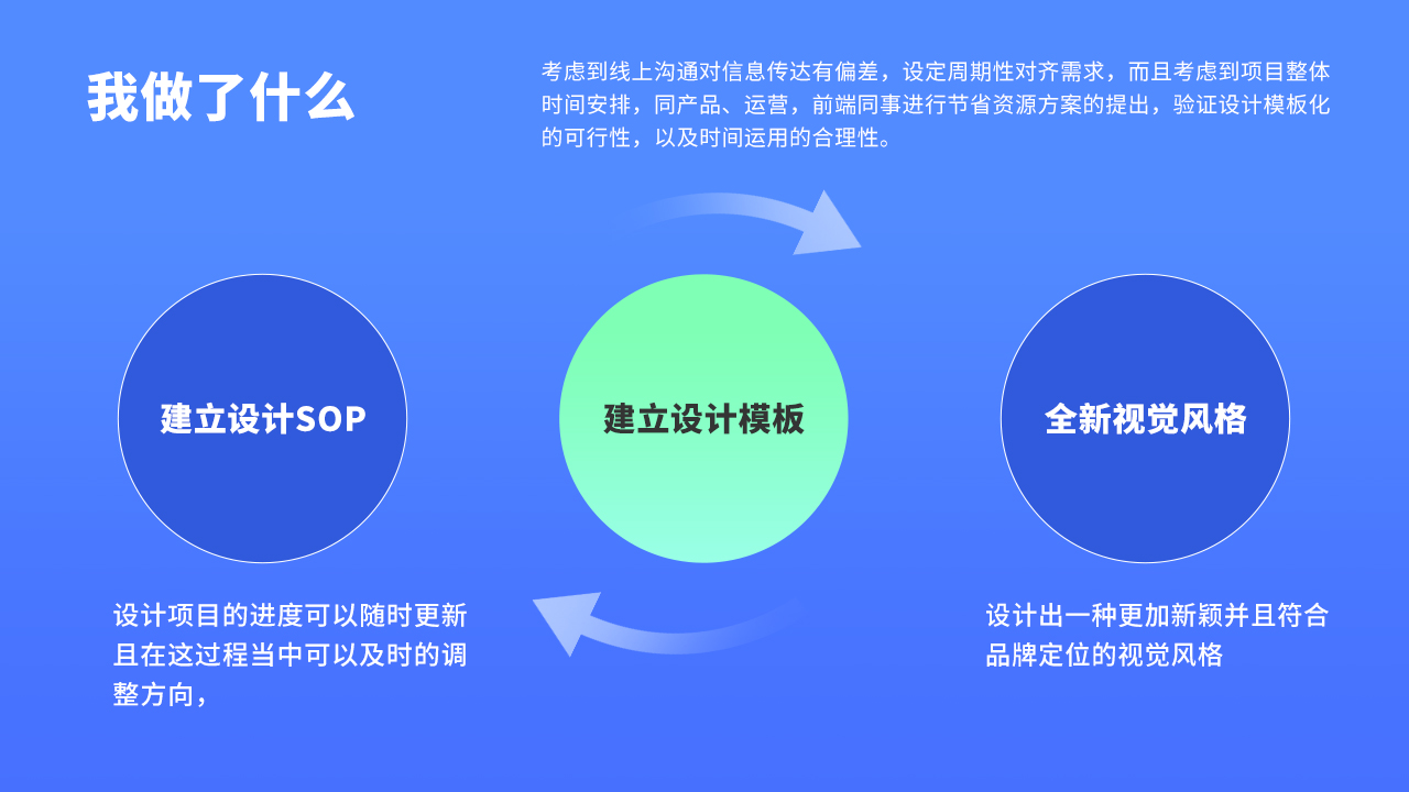 然后將直接負責人拉通對齊目標,例舉并思考每個業務板塊的優劣勢,考慮到線上溝通對信息傳達有偏差,設定周期性對齊需求,而且考慮到項目整體時間安排,同產品、運營,前端同事進行節省資源方案的提出,驗證設計模板化的可行性,以及時間運用的合理性。