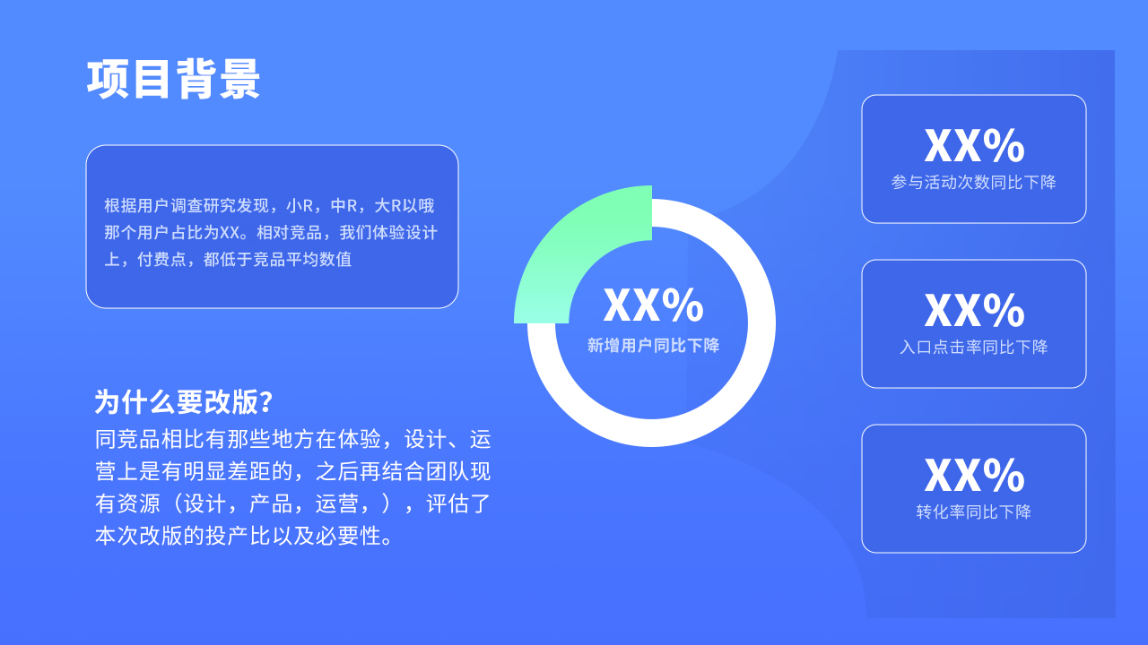這一點很多同學會忽略掉,從一開始就已經犯了一個致命的錯誤,那就是沒有項目背景,下面的評委不僅僅是你的leader,還有各個部門的負責人,也許針對你的項目,他們根本無從了解,唯一的渠道也去就是你的介紹和講解,因此這一部分是不能忽略掉的。