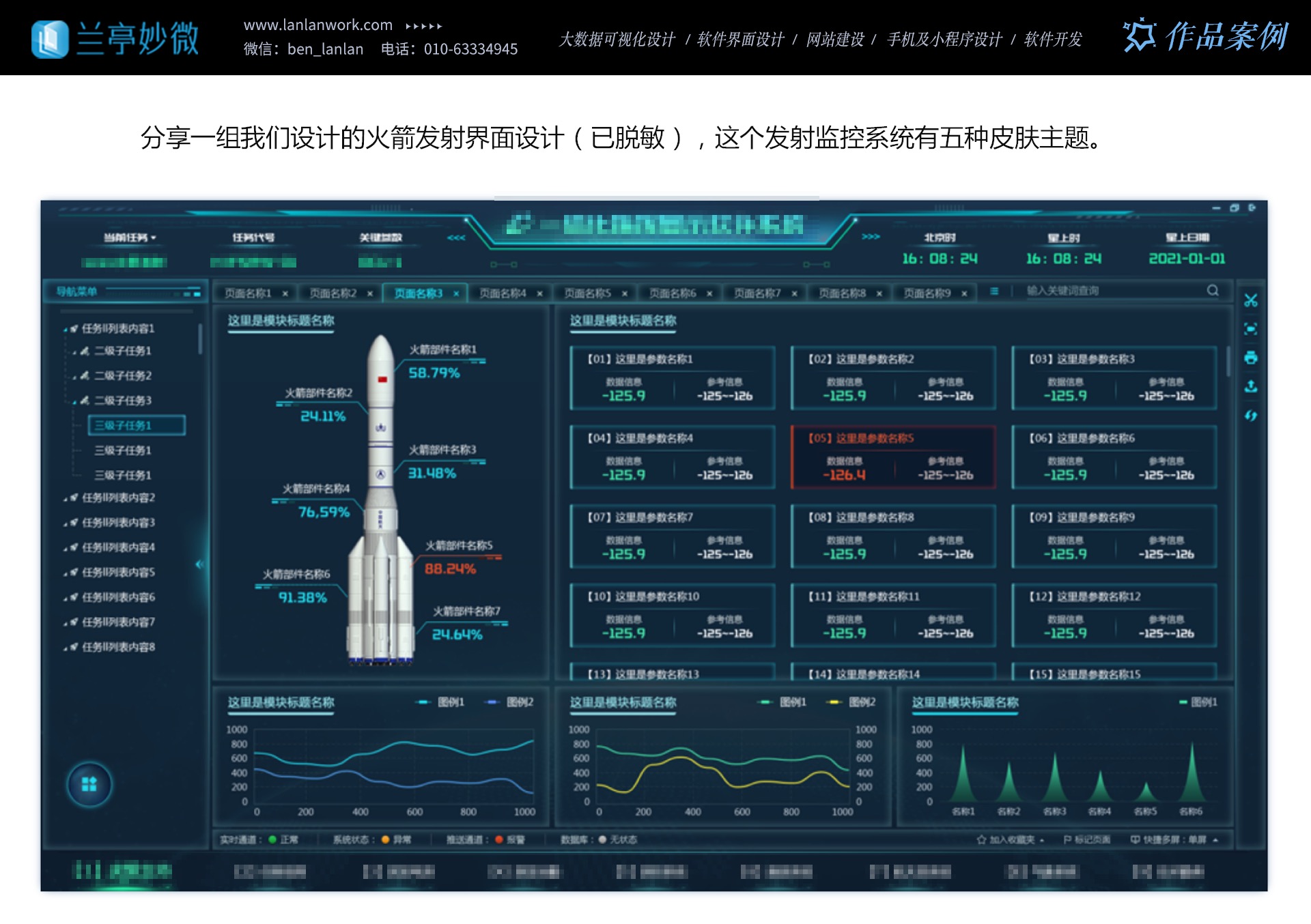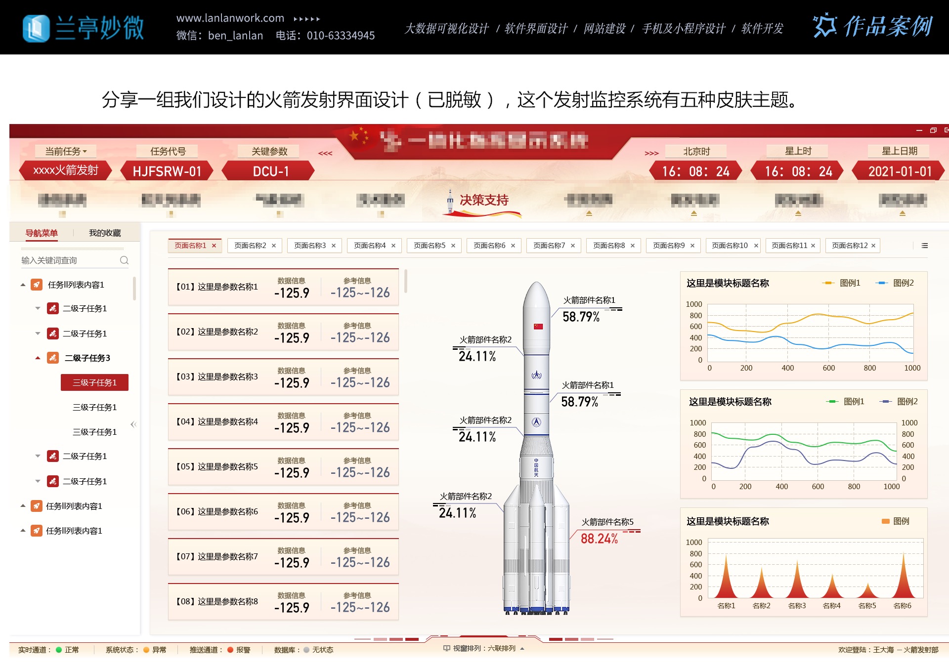 多年來,蘭亭妙微與航天四院、二院、三院、九院、中國電子等緊密合作,完成了多個重點(diǎn)項(xiàng)目。他們的設(shè)計(jì)成功助力企業(yè)增強(qiáng)了品牌形象,提升了競爭力,提高了工作效率與產(chǎn)品滿意度,降低了培訓(xùn)成本,增強(qiáng)了安全性。選擇蘭亭妙微,就是選擇航天軍工領(lǐng)域最專業(yè)、最可靠的 UI 設(shè)計(jì)合作伙伴。讓我們攜手共創(chuàng)卓越未來,為航天軍工事業(yè)的發(fā)展貢獻(xiàn)力量。