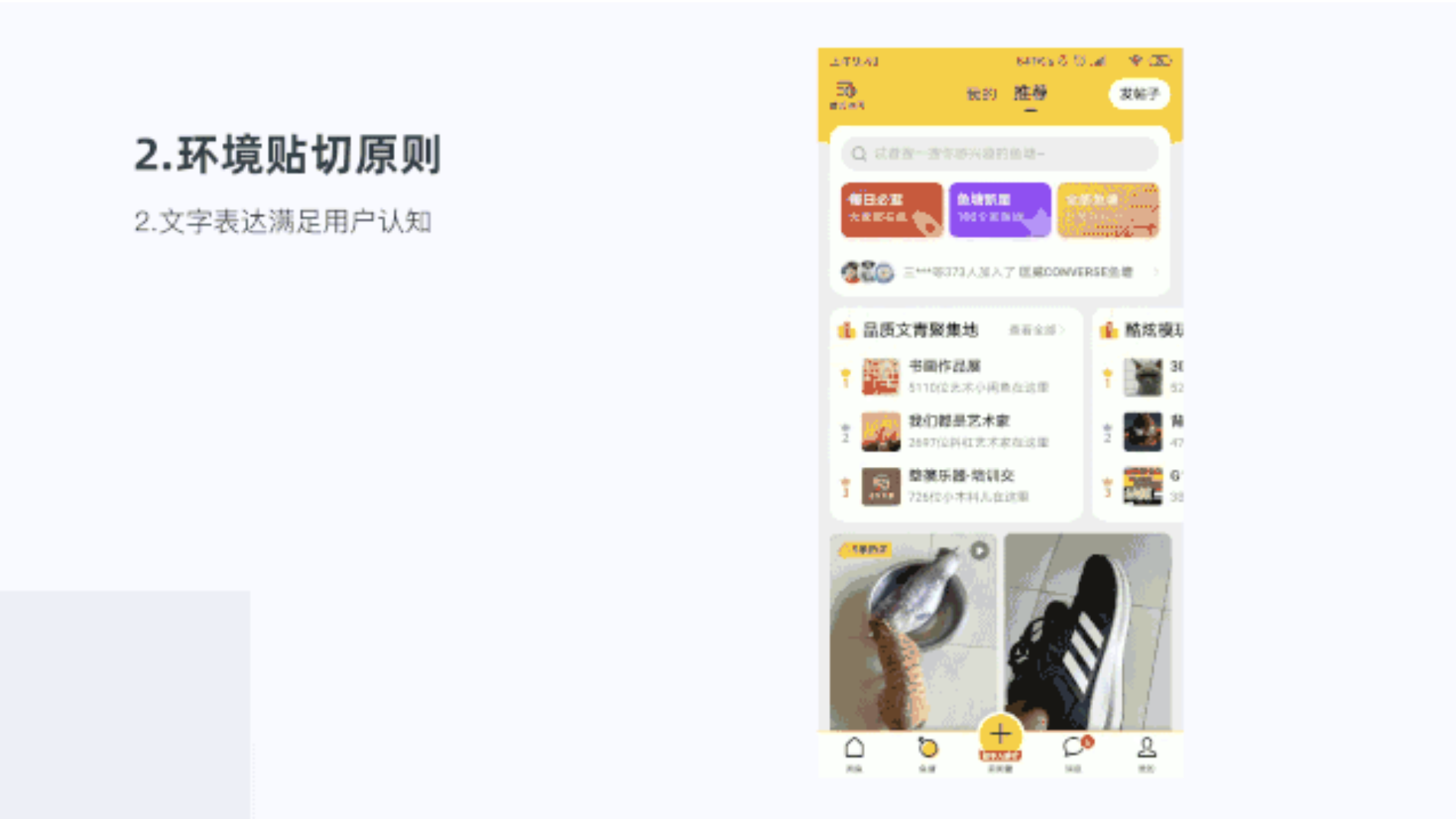 在魚塘頁面,文藝書畫、樂器等興趣魚塘,我們叫品質文青聚集地,文藝青年在當下比較火的網絡名詞,喜歡文化藝術的青年哈哈。符合用戶年齡人群的環境認知。