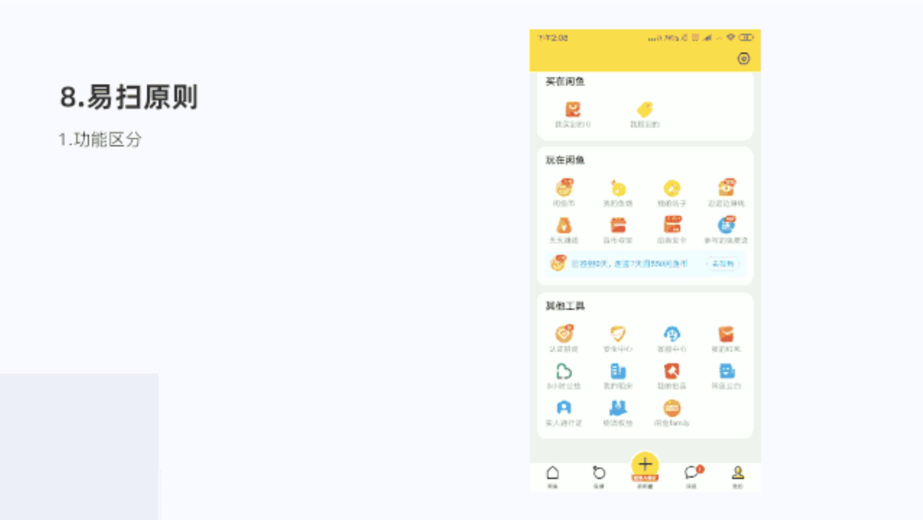 閑魚的我的頁面,每個區塊進行功能區分,分為買、賣、玩、其他4個主要部分。降調層級,同時在區塊內每個功能圖標宮格顯示,也易于用戶查找,滿足了易掃原則,提示了用戶體驗。