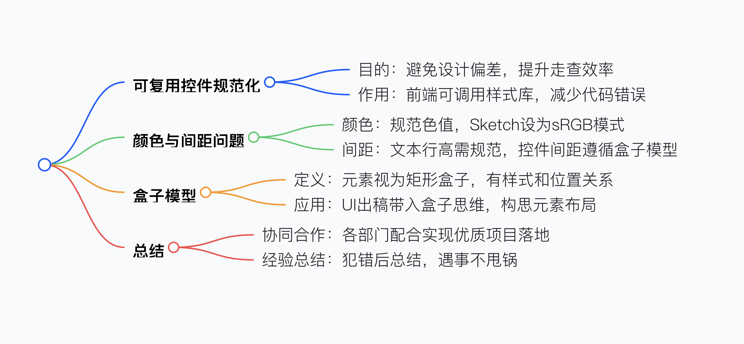UI 設計師若想讓前端實現設計稿的像素級還原,需在出稿時注意:將可復用控件規范化并輸出文檔,避免相同控件樣式或交互不一致;把控顏色(規范色值、將 Sketch 顏色配置改為 sRGB)和間距(設定文本行高規范、考慮控件間距的盒子模型);遵守盒子模型,將界面布局盒子化,輔助前端準確定位元素,如此才能通過各部門協同合作實現優質項目落地。