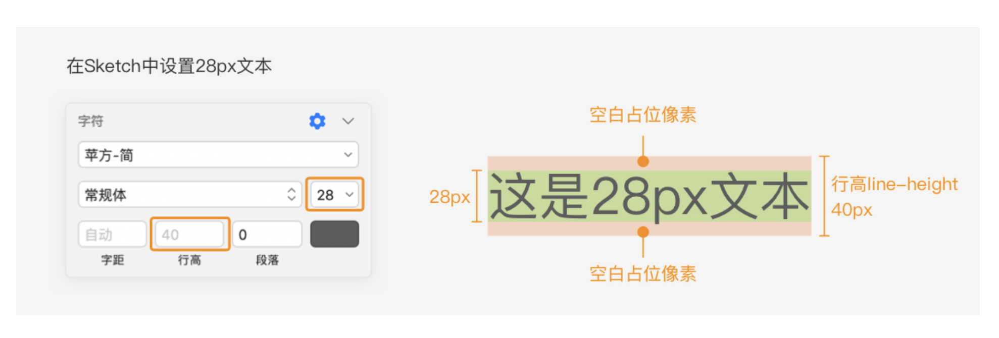 • 文本間距:文本行高可能導致前端測量誤差,如 28px 文本 Sketch 默認行高 40px,上下含空白像素,UI 需輸出規范行高(如 x 倍行高或具體值)與前端對接,避免因行高導致間距落地偏差。
