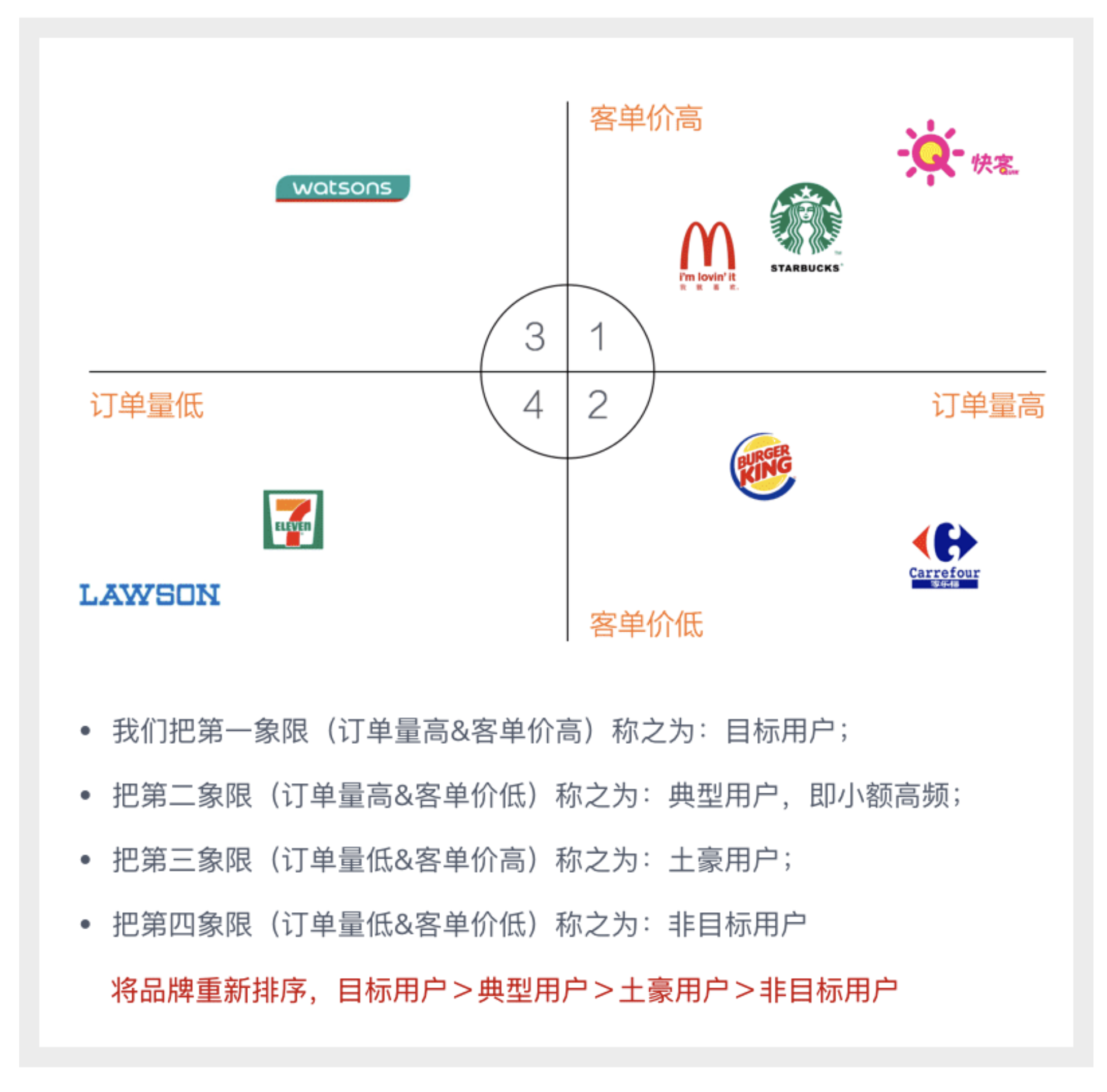 • 設計邏輯:基于專業知識技能中的 “設計判斷力”,運用交叉分析方法,結合用戶畫像(購買偏好)、可用性測試(用戶使用習慣)和產品訴求(階段目標),將品牌按用戶訂單量和客單價劃分為目標用戶、典型用戶、土豪用戶、非目標用戶四類,并按優先級排序展示,增強了功能易用性,提升了用戶匹配度。