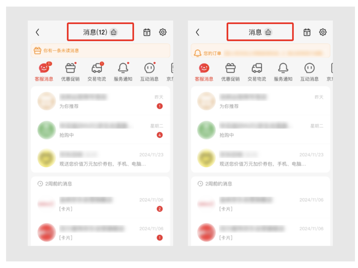京東的核心用戶是追求效率的年輕人,他們熟悉 “圖標語言”,覺得文字按鈕太啰嗦。所以京東用 “掃把” 圖標代替文字,放在消息頁頂部,像 “掃垃圾” 一樣清理未讀標記,簡潔又符合直覺。