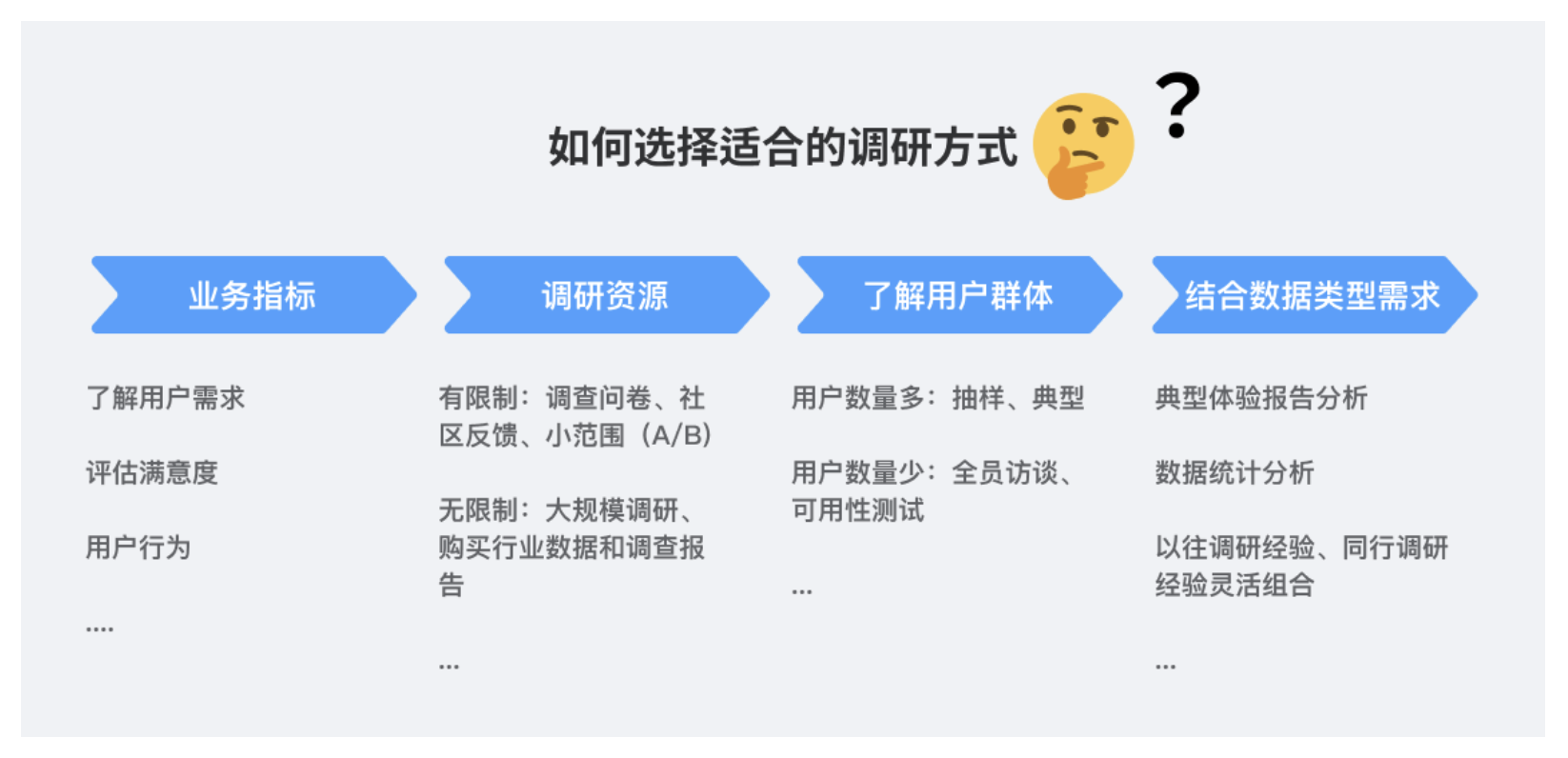 難點在于 “資源有限”—— 不可能每次都做全所有調研,需根據目標選方法:比如要快速了解 “新用戶注冊痛點”,選 10 個典型新用戶做訪談,比做 1000 份問卷更高效。