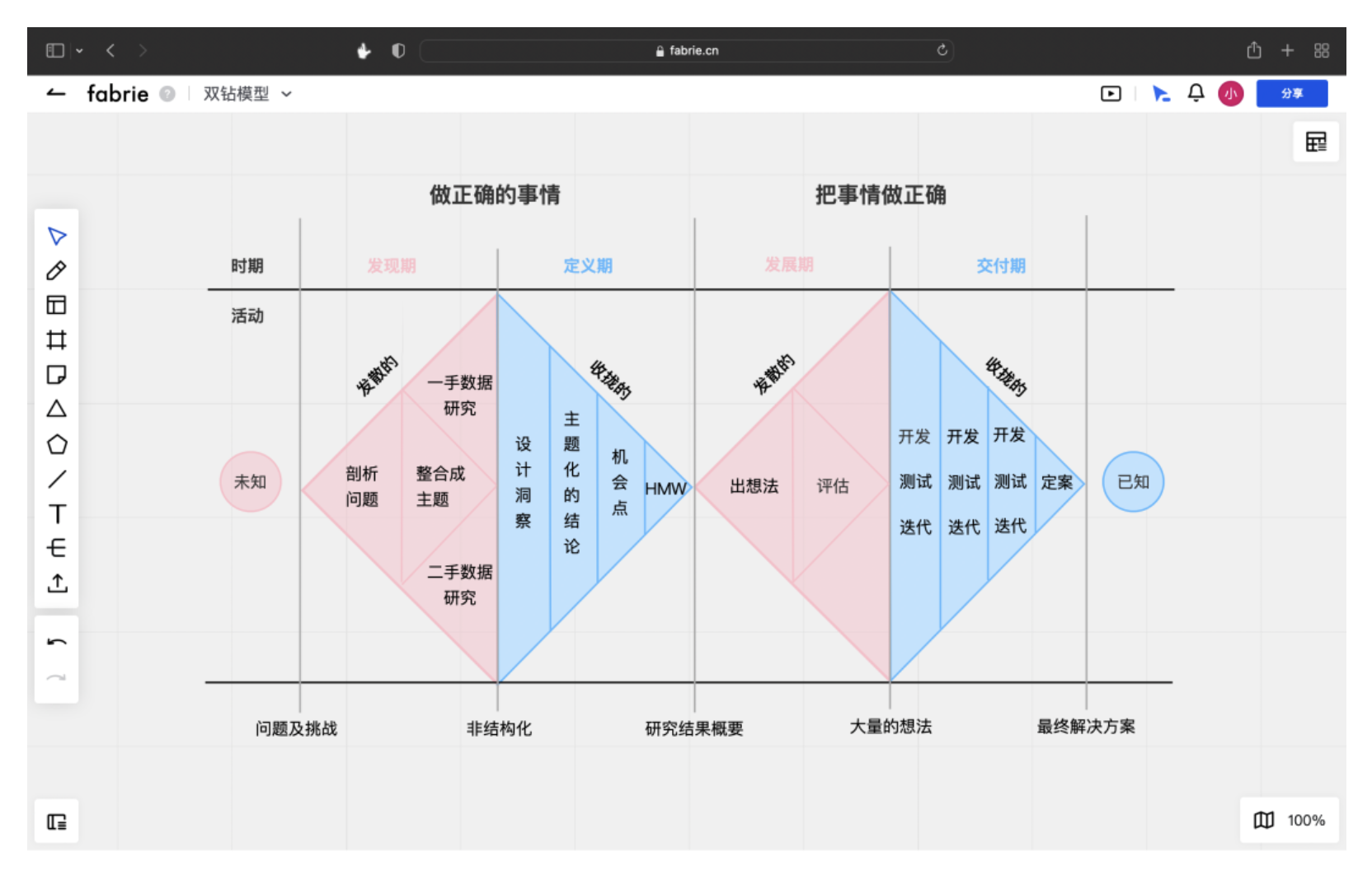 雙鉆模型是設計思維的核心框架,分為發(fā)現(xiàn)期、定義期、發(fā)展期、交付期四個階段,通過 “發(fā)散 - 收攏” 的循環(huán)確保設計方向正確且執(zhí)行到位。但很多設計師因缺乏工具支撐,難以完整踐行這一流程。